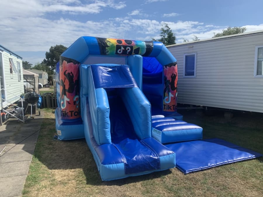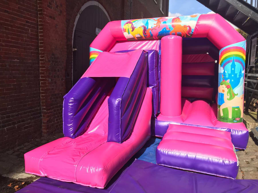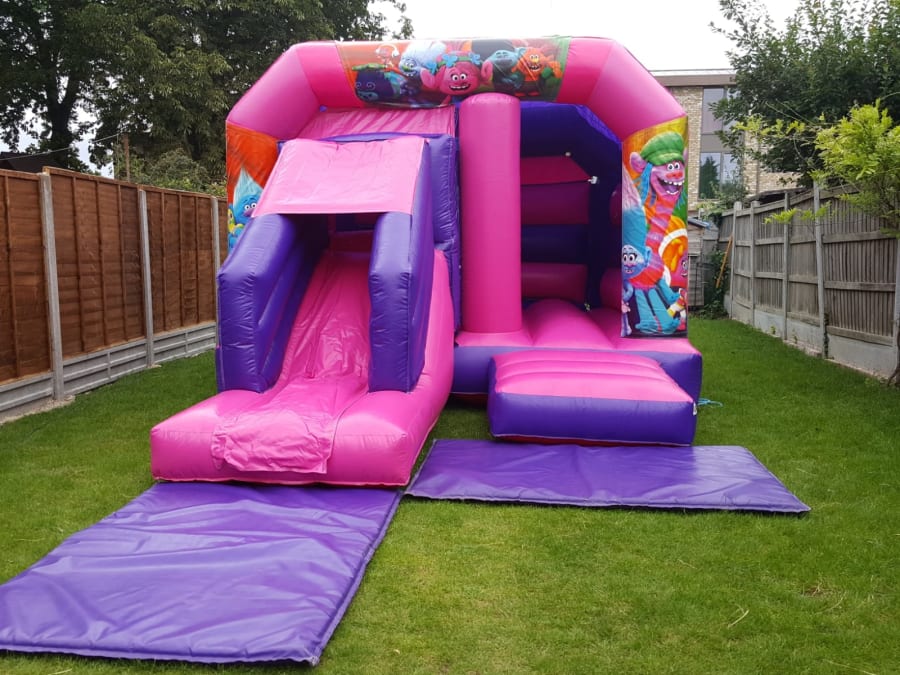 This package should be a simple way of choosing any colour 12ft Wide x 18ft Long inflatable with a Front Slide plus your choice of Theme. Each theme consists of 3 Velcro banners that are quickly attached to the top and front sides after inflating the bouncy castle replacing the printed party theme.