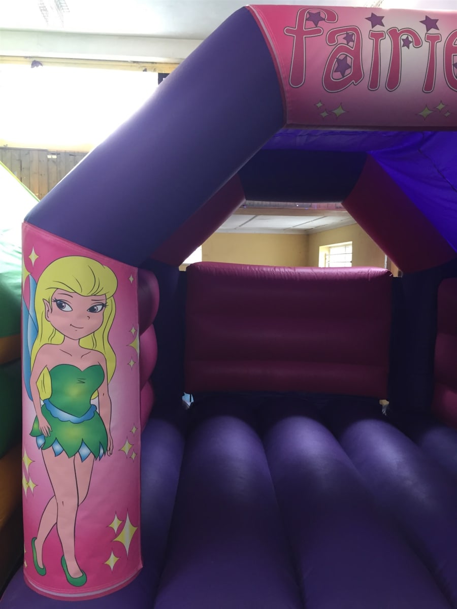 This is our 11x15 foot Pink and Purple Fairy themed bouncy castle. This Fairy themed pink bouncy castle is perfect hall hires or garden parties, with a smaller profile roof height of only 9 1/2 foot, coming in under many of the local halls 10 foot/3 metre limit.