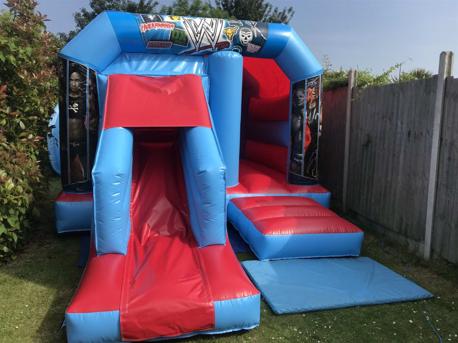 This amazing bouncy castle is designed in a red and blue party themed artwork.