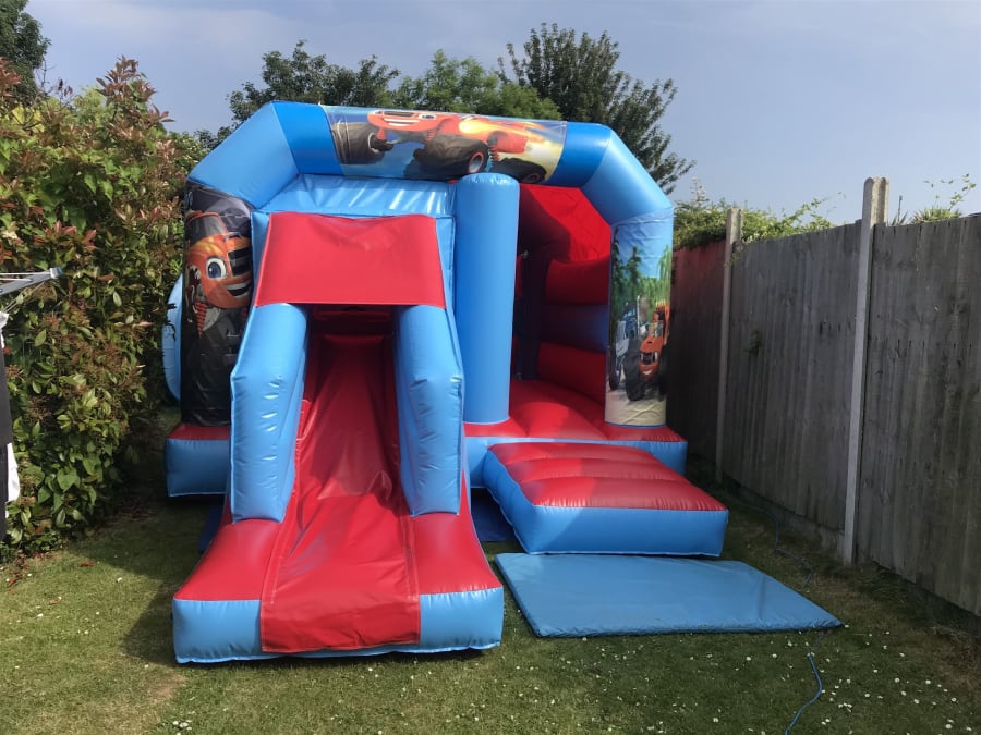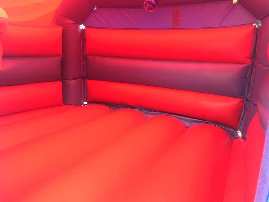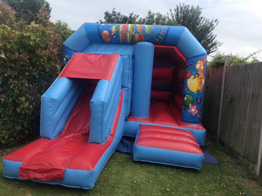This amazing bouncy castle is designed in a red and blue party themed artwork.