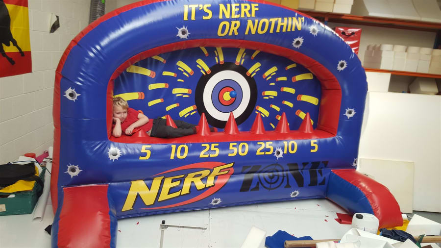 This neat inflatable Nerf shoot out is a real must for any nerf loving children. Simply load the gun with foam bullets then aim and fire at the floating balls off their. Aim of the game is to knock the floating plastic balls off.