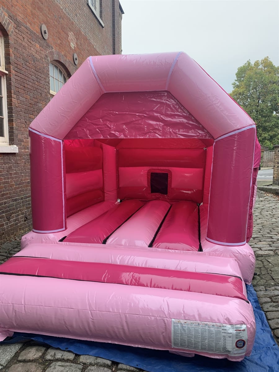 What a stunning bouncy castle this is, this is one of our most recent additions to our portfolio and was carefully custom made by one of the best UK manufacturers. It is a two tone light pink bouncy castle made is shiny gloss material, as its brand new its super bouncy and has a sewn in rain cover as the weather has been so unpredictable this year!