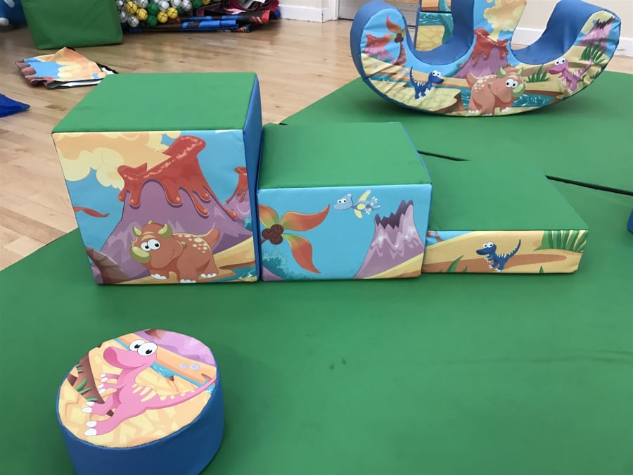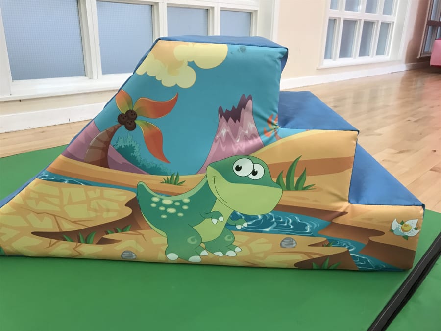 Consists of slide, double rocker, assortment of soft shapes with colourful dinosaur patten all over them.