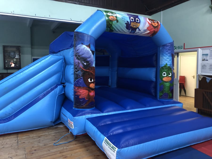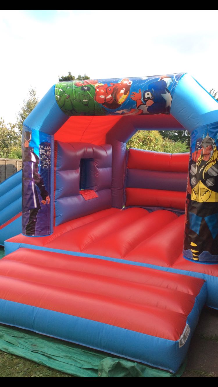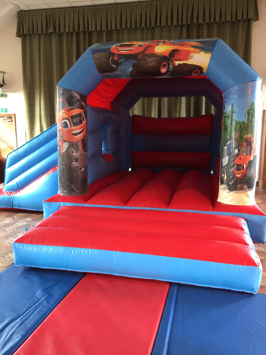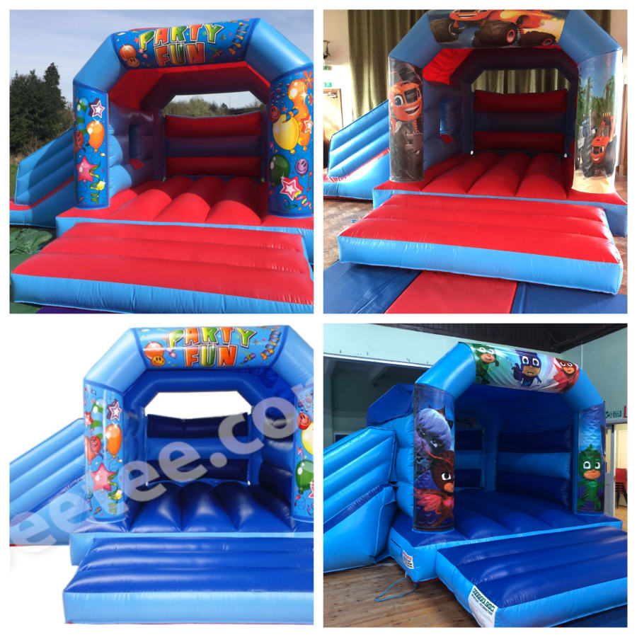 This package should be a simple way of choosing any colour 18ft Wide x 15ft Long inflatable with side slide plus your choice of Theme. Each theme consists of 3 Velcro banners that are quickly attached to the top and front sides after inflating the bouncy castle replacing the printed party theme.
